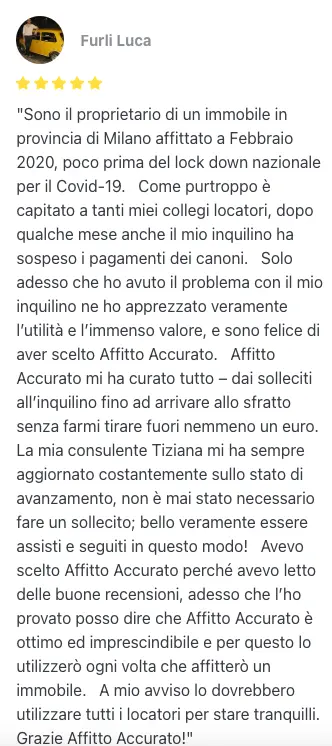 “Sono molto soddisfatto!!! Mi avete bonificato tutte le mensilità e le spese condominiali e mi hanno liberato l’immobile nonostante il blocco degli sfratti!! Seri, professionali e affidabili.”